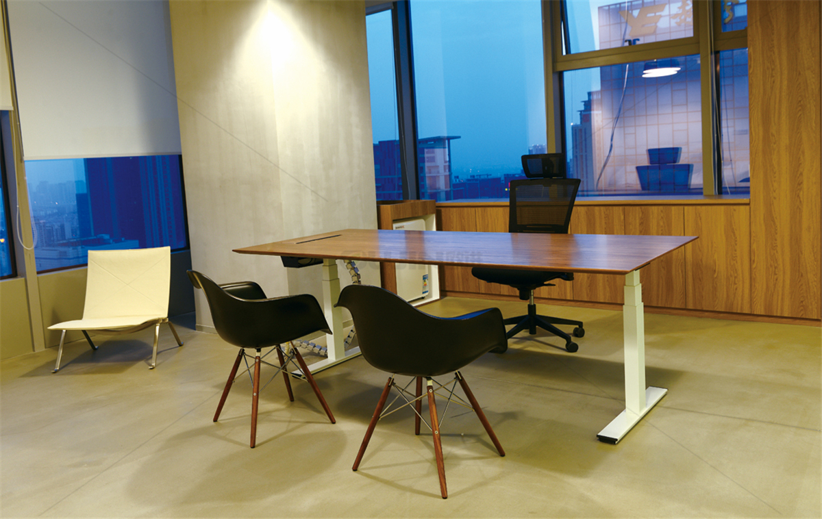 會議區(qū)設計較為工業(yè)風,主色調與整個辦公空間保持一致。會議桌采用胡桃木色實木貼皮工藝,配套白色皮質辦公轉椅,使整個會議室既有工業(yè)風的粗曠又有現(xiàn)代工業(yè)的精致。歐進家具都采用了靈活會議桌設計都表現(xiàn)出高度的空間適應性,并配置了多媒體設備,讓與會人員溝通更加輕松自如。